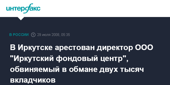 В Иркутске арестован директор ООО "Иркутский фондовый центр", обвиняемый в обмане двух тысяч вкладчиков