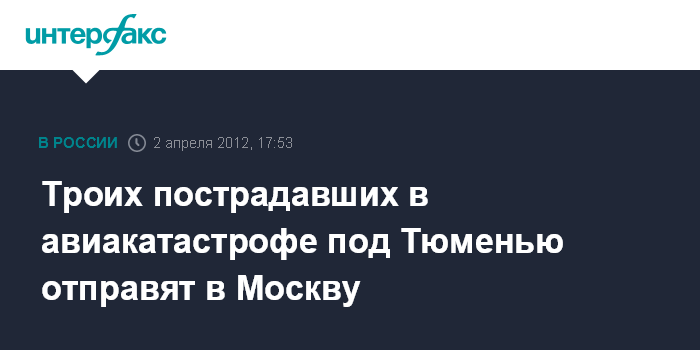 Москва. 2 апреля. INTERFAX.RU - Трое жителей Тюмени, пострадавшие при катастрофе самолета ATR-72, будут доставлены для лечения в Москву, сообщили в ГУ МЧС РФ по Тюменской области.