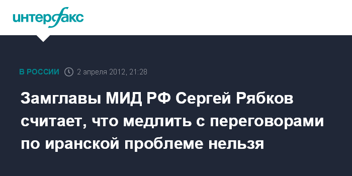 Замглавы МИД РФ Сергей Рябков считает, что медлить с переговорами по иранской проблеме нельзя