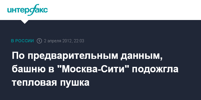Москва. 2 апреля. INTERFAX.RU - Источником пожара на башне комплекса "Москва-сити" могла стать тепловая пушка, оставленная без присмотра, сообщил "Интерфаксу" источник в правоохранительных органах. По его словам, от тепловой пушки для подогрева битума произошло возгорание мусора и обрешетника рекламного баннера в верхней части здания.