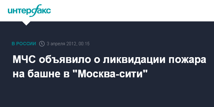 Москва. 3 апреля. INTERFAX.RU - Пожар на башне на ММДЦ "Москва-сити" ликвидирован, сообщил журналистам замначальника ГУ МЧС России по Москве Илья Денисов.