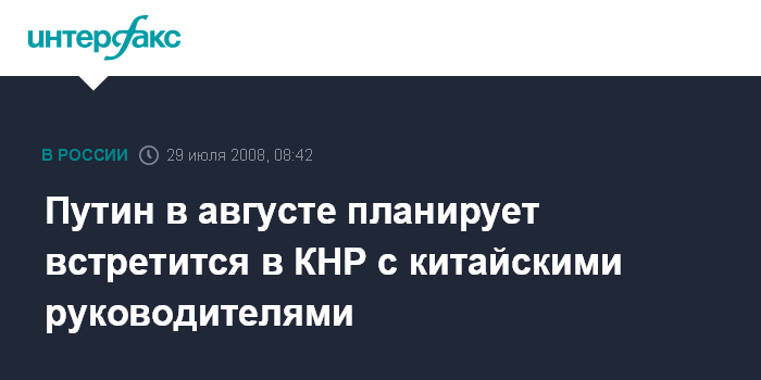 Москва. 29 июля. INTERFAX.RU - Как ожидается, председатель правительства России Владимир Путин посетит Китай 8-9 августа 2008 года, заявил во вторник на брифинге советник-посланник посольства РФ в КНР Игорь Моргулов.