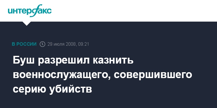 Москва. 29 июля. INTERFAX.RU - Разрешение на казнь солдата, признанного виновным в четырех убийствах и восьми изнасилованиях, дал президент США Джордж Буш.