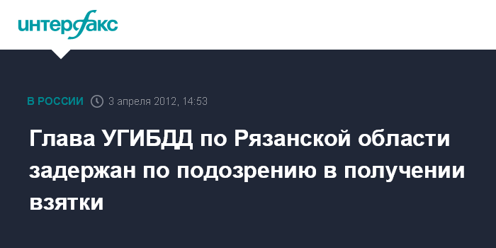 Москва. 3 апреля. INTERFAX.RU - Начальник Управления ГИБДД УМВД РФ по Рязанской области Александр Алфосов и несколько его подчиненных подозреваются во взяточничестве, сообщили в пресс-центре МВД РФ.