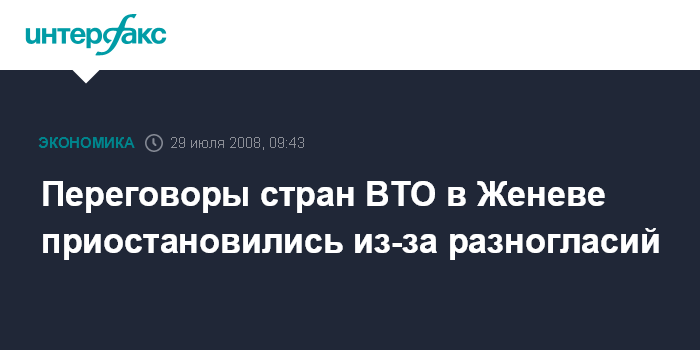 Москва. 29 июля. INTERFAX.RU - Переговоры по соглашению о либерализации мировой торговли, идущие вторую неделю в Женеве, натолкнулись на новые препятствия, сообщило агентство Bloomberg.