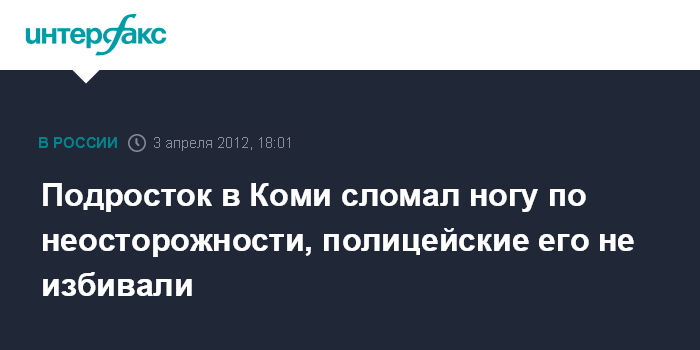 Москва. 3 апреля. INTERFAX.RU - Полицейские не избивали 13-летнего подростка в Коми, он сам поскользнулся на льду, заявила уполномоченный по правам ребенка в республике Нелли Струтинская.