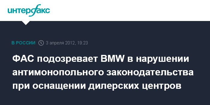 Москва. 3 апреля. INTERFAX.RU - Федеральная антимонопольная служба (ФАС) РФ возбудила дела в отношении ООО "БМВ Русланд Трейдинг" (подразделение германского автопроизводителя Bayerische Motoren Werke (BMW) в России) и ООО "ТД "Эквинет" по признакам нарушения закона "О защите конкуренции".