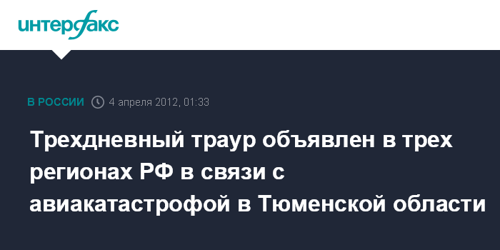 Трехдневный траур объявлен в трех регионах РФ в связи с авиакатастрофой в Тюменской области