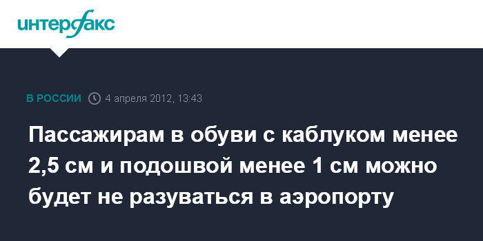 Москва. 4 апреля. INTERFAX.RU - Минтранс РФ намерен внести изменения в правила проведения предполетного и послеполетного досмотра, которые позволят пассажирам в обуви с высотой каблука менее 2,5 см и толщиной подошвы менее 1 см не разуваться.