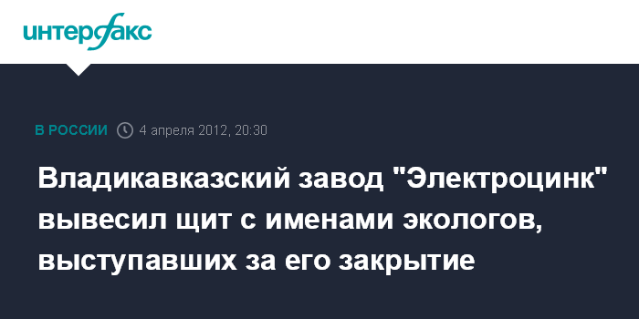 Владикавказ. 4 апреля. INTERFAX.RU - Руководство ОАО "Электроцинк" (входит в УГМК) вывесило большой щит с надписью "Они хотят лишить вас работы" и именами членов экологических организации, выступавших против загрязнения окружающей среды вследствие деятельности метзавода во Владикавказе.