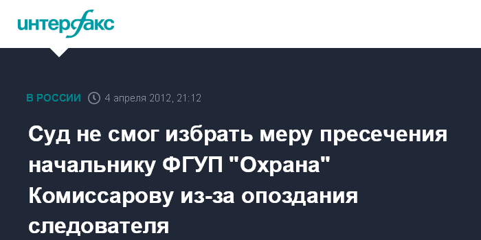 Москва. 4 апреля. INTERFAX.RU - Следователь вовремя не явился в суд с материалами дела задержанного ранее начальника ФГУП "Охрана" Андрея Комиссарова, которому в среду, по информации источников в правоохранительных органах, должны были избрать меру пресечения. Как передает корреспондент "Интерфакса", следователь пришел в суд уже после 18:00, когда уже нельзя подавать материалы дела.
