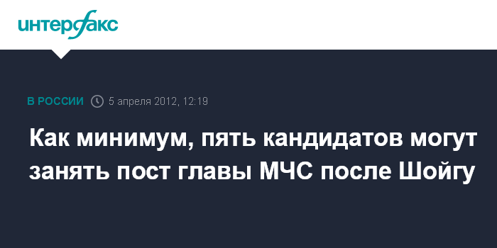 Москва. 5 апреля. INTERFAX.RU - Утвержденный Мособлдумой в должности губернатора Московской области Сергей Шойгу заявил, что на пост главы МЧС после его ухода из ведомства может рассматриваться, по меньшей мере, пять кандидатов.