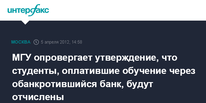 Москва. 5 апреля. INTERFAX.RU - В МГУ заверяют, что не будут отчислять студентов, оплативших обучение через обанкротившийся банк.
