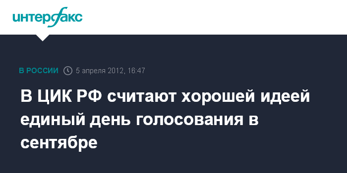 Москва. 5 апреля. INTERFAX.RU - В руководстве ЦИК РФ считают, что одобренная президентом РФ Дмитрием Медведевым идея введения единого дня голосования в сентябре оптимальна с точки зрения организации, финансирования и обеспечения безопасности региональных и местных выборов.