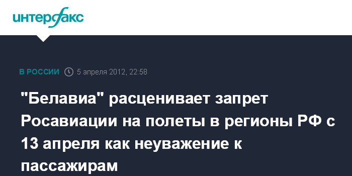 Минск. 5 апреля. INTERFAX.RU - Генеральный директор белорусской национальной авиакомпании "Белавиа" Николай Гусаров усматривает проявление неуважения в действиях "Росавиации", запретившей белорусской стороне с 13 апреля выполнять полеты во все регионы России.