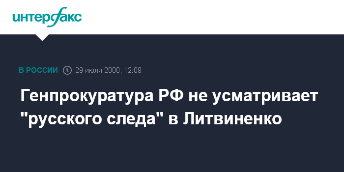 Москва. 29 июля. INTERFAX.RU - Генеральная прокуратура РФ по-прежнему не усматривает так называемого "русского следа" в деле об убийстве экс-сотрудника российских спецслужб Александра Литвиненко, заявил генпрокурор РФ Юрий Чайка во вторник по окончании коллегии Генпрокуратуры, отвечая на вопрос "Интерфакса".