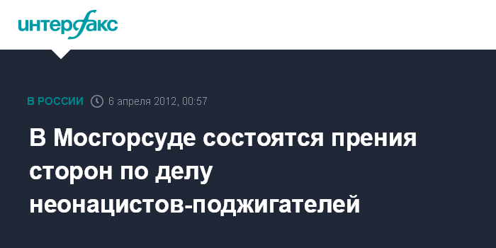 Москва. 6 апреля. ИНТЕРФАКС - Прения сторон по делу неонацистов, которых обвиняют в серии поджогов и подрывов в Москве, пройдут в пятницу в Мосгорсуде.
