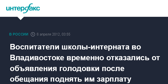 Владивосток. 6 апреля. ИНТЕРФАКС-ДАЛЬНИЙ ВОСТОК - Около 20 воспитателей Владивостокской коррекционной школы-интерната N2 (ВКШИ), которые заявляли о готовности к радикальным протестным акциям из-за низкой зарплаты, после встречи с представителями властей и депутатами временно отказались от своих намерений.