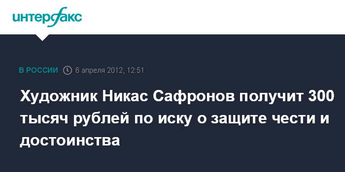 Москва. 6 апреля. INTERFAX.RU - Савеловский суд Москвы обязал взыскать 300 тыс. рублей в пользу художника Никаса Сафронова с жительницы Ростова-на-Дону Мэри Восканян, обвинившей его в изнасиловании. Также суд обязал взыскать 600 тыс. рублей с ООО "Горизонт", разместившего видеозапись с обвинением Восканян на своем сайте. На сайте должно появиться официальное опровержение.