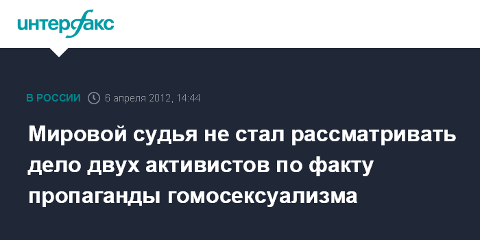 Санкт-Петербург. 6 апреля. INTERFAX.RU - Мировой судья участка N203 Санкт-Петербурга Алексей Кузнецов отправил на дооформление в отдел полиции протокол о правонарушении по статье за пропаганду гомосексуализма задержанных накануне активистов городского ЛГБТ-движения.