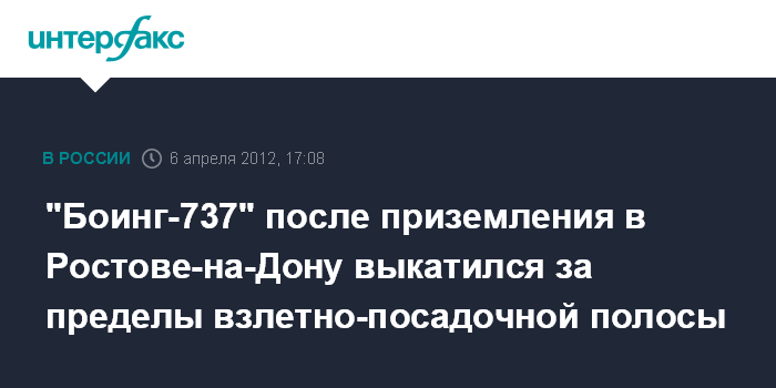 Москва. 6 апреля. INTERFAX.RU - Пассажирский "Боинг" авиакомпании "Глобус" выкатился за пределы взлетно-посадочной полосы после приземления в аэропорту Ростова-на-Дону, сообщил "Интерфаксу" источник в авиадиспетчерских службах Ростовского авиаузла.