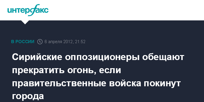 Лондон/Бейрут. 6 апреля. INTERFAX.RU - Бойцы Свободной сирийской армии выражают готовность прекратить военные действия, если президент Сирии Башар Асад выведет войска из городов до 12 апреля, сообщают в пятницу западные СМИ.