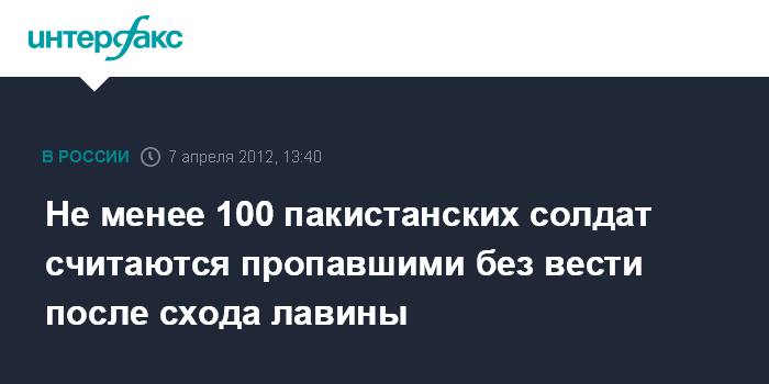 Исламабад. 7 апреля. INTERFAX.RU - По меньшей мере, 100 военнослужащих Пакистана считаются пропавшими без вести после того, как они попали под лавину в пакистанской части области Кашмир, на северо-востоке страны, сообщил местным журналистам представитель армии генерал Атар Аббас. "Около шести часов утра военную казарму накрыла лавина, под нее попали около 100 солдат", - сказал он.