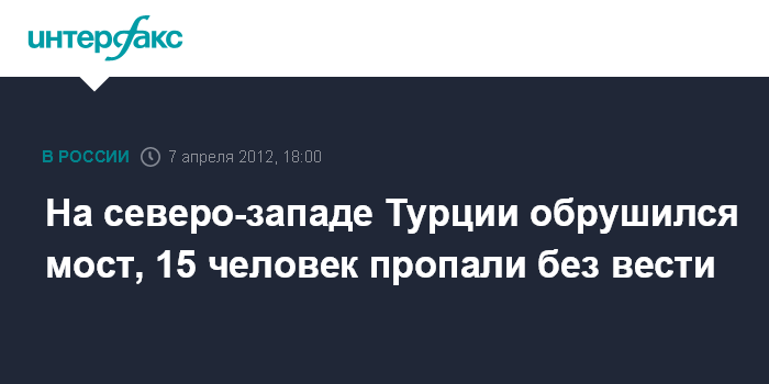 Стамбул. 7 апреля. INTERFAX.RU - По меньшей мере, 15 человек пропали без вести в результате обрушения в реку секции 150-метрового моста в провинции Зонгулдак, на северо-западе Турции, сообщил в субботу местным журналистам министр труда и социальной защиты страны Фарук Челик. "Наши спасатели ведут поиски людей по всей реке, но они работают в очень сложных условиях, на данный момент у нас нет сведений о 15 пострадавших", - сказал он.