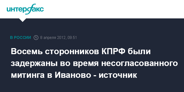 Как отметил собеседник агентства, полицейские задержали восьмерых участников митинга в Иваново. "В Иваново после попытки проведения несогласованного с органами власти пикетирования 125 сторонников КПРФ по проспекту Ленина проследовали до бульвара Кокуй Ленинского района, где в течение 1 часа 20 минут с использованием звукоусиливающей аппаратуры провели митинг, протестуя против социально-экономической политики в системе ЖКХ, проводимой правительством Российской Федерации", - рассказал источник.