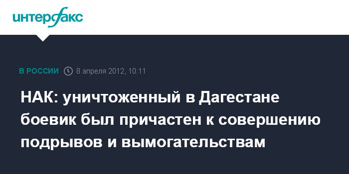 Москва. 8 апреля. INTERFAX.RU - Ликвидированный в Дагестане боевик входил в так называемую хасавюртовскую бандгруппу, сообщает Национальный антитеррористический комитет (НАК).