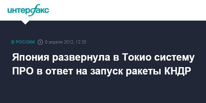 Токио. 8 апреля. INTERFAX.RU - Японские власти развернули в Токио систему ПРО на фоне запланированного запуска северокорейского спутника, сообщают в воскресенье местные СМИ. Ранее сообщалось, что главы МИД региональных держав - Южной Кореи, Японии и Китая - встретились в Китае для обсуждения проблемы запуска ракеты КНДР