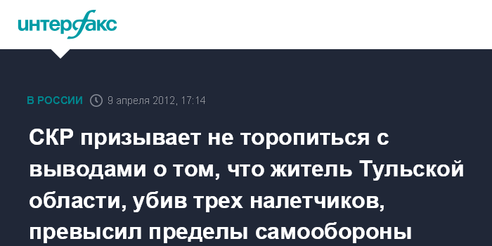 СКР призывает не торопиться с выводами о том, что житель Тульской области, убив трех налетчиков, превысил пределы самообороны