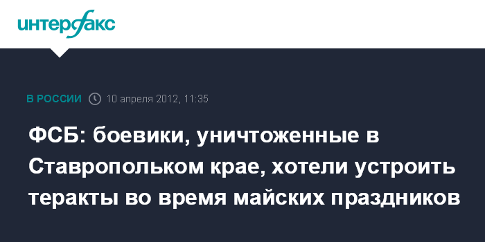 Пятигорск. 10 апреля. INTERFAX.RU - Боевики, которые были уничтожены в ночь на 10 апреля в Нефтекумском районе Ставропольского края, готовили теракты в предстоящие религиозные и майские праздники, сообщила пресс-служба Управления ФСБ России по Ставропольскому краю.