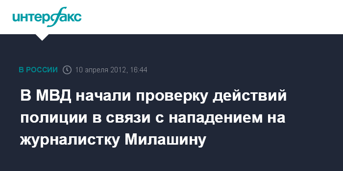 Москва. 10 апреля. INTERFAX.RU - МВД начало служебную проверку по действиям полиции, к которой обратилась после избиения журналистка "Новой газеты" Елена Милашина.