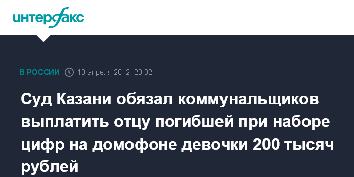 Казань. 10 апреля. INTERFAX.RU - Авиастроительный районный суд Казани во вторник постановил взыскать с районной управляющей компании ЖКХ 200 тыс. рублей отцу 13-летней Ирины Сорокиной, которая в июле 2007 г. получила смертельный удар током после того, как набрала номер на домофоне дома.