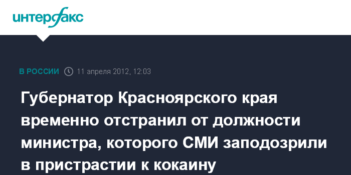 Красноярск. 11 апреля. INTERFAX.RU - Министр транспорта Красноярского края Захар Титов отстранен от должности после того, как один из местных телеканалов распространил информацию об обнаружении в его квартире кокаина, сообщили агентству "Интерфакс-Сибирь" в пресс-службе губернатора региона.