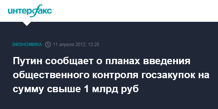 Москва. 11 апреля. INTERFAX.RU - В России будет введен общественный контроль за госзакупками на сумму свыше одного миллиарда рублей, чиновники-руководители госкомпаний и ВУЗов будут отчитываться о доходах и имуществе, сообщил премьер РФ Владимир Путин. "Мы внедрим практику общественного контроля государственных закупок на сумму свыше одного млрд. рублей. Все крупные инвестиционные проекты с госучастием также должны проходить обязательный публичный технологический и ценовой аудит", - сказал Путин, выступая в среду в Госдуме с отчетом о деятельности правительства.