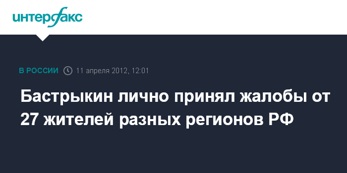 "10 апреля Александр Бастрыкин провел прием граждан в здании Следственного комитета России. Всего на личном приеме председателем СК России было принято 27 жителей Москвы, Петербурга, Московской, Ростовской, Брянской, Калужской областей, Краснодарского, Красноярского краев и ряда других регионов", - сообщил "Интерфаксу" официальный представитель СК Владимир Маркин.