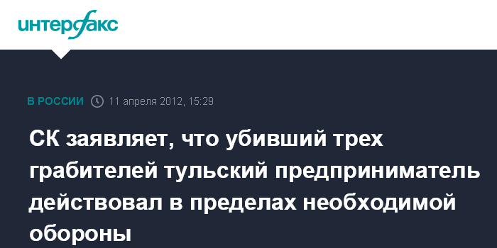 Москва. 11 апреля. INTERFAX.RU - Тульский предприниматель Гагик Саркисян, убивший трех вооруженных грабителей, действовал правомерно, сообщил официальный представитель СК РФ Владимир Маркин. "Полученные на сегодняшний день следствием данные свидетельствуют о том, что Саркисян действовал в пределах необходимой обороны от преступного нападения четверых вооруженных грабителей", - сказал Маркин в среду "Интерфаксу".