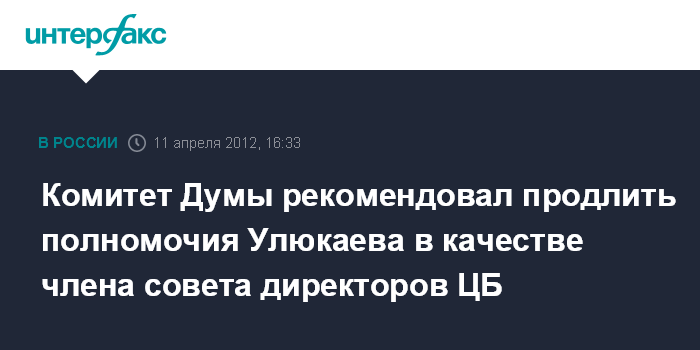 Москва. 11 апреля. INTERFAX.RU - Комитет Госдумы по финансовому рынку на заседании в среду рекомендовал нижней палате парламента назначить первого заместителя председателя Банка России Алексея Улюкаева членом совета директоров ЦБ РФ.