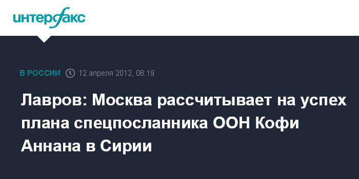 Вашингтон. 12 апреля. ИНТЕРФАКС - В Москве рассчитывают на успех плана спецпосланника ООН Кофи Аннана, однако во избежание провокаций выступают за скорейшее направление в Сирию наблюдателей.
