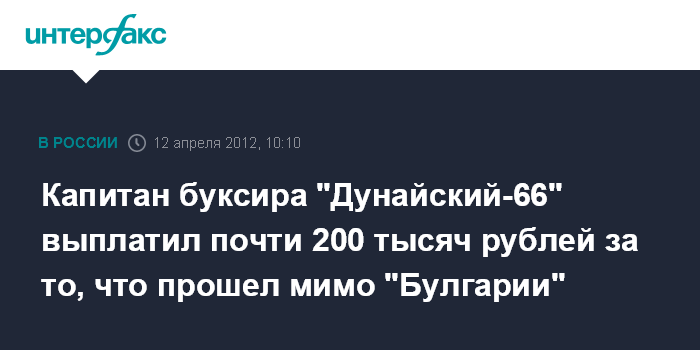 Казань. 12 апреля. INTERFAX.RU - Капитан буксира "Дунайский-66" Александр Егоров (город Чайковский, Пермский край) выплатил штраф в пользу государства, назначенный ему судом за неоказание помощи терпящим бедствие при крушении теплохода "Булгария".