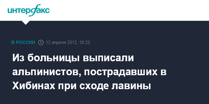 Санкт-Петербург. 12 апреля. INTERFAX.RU - Пострадавших при сходе лавины в Хибинах в Мурманской области альпинистов уже выписали из больницы, сообщила в четверг пресс-служба Санкт-Петербургского государственного политехнического университета.