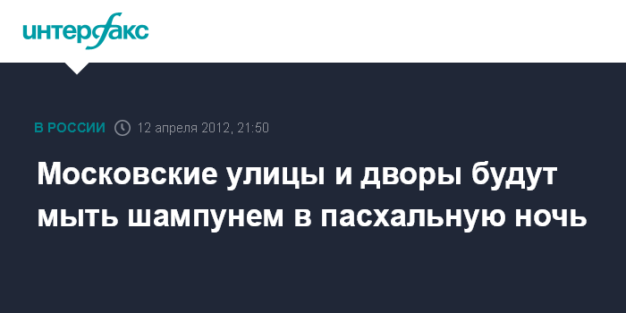 12 апреля. INTERFAX.RU - Промывка московских улиц, тротуаров и дворов шампунем состоится в пасхальную ночь на 15 апреля. Ее проведут коммунальные службы.