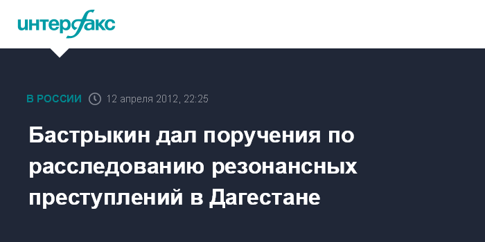 Москва. 12 апреля. INTERFAX.RU - Председатель Следственного комитета РФ Александр Бастрыкин дал конкретные поручения руководителям следственных групп и подразделениям МВД и ФСБ России по расследованию ряда резонансных дел о преступлениях, совершенных на территории Дагестана.