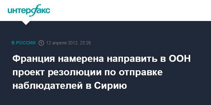 Вашингтон. 12 апреля. INTERFAX.RU - В четверг на рассмотрение ООН будет вынесен проект резолюции, предусматривающей отправку наблюдателей организации в Сирию, заявил в Вашингтоне министр иностранных дел Франции Ален Жюппе в рамках встречи глав МИД стран-членов "большой восьмерки".