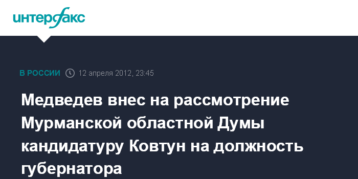 "Президент России Д.А.Медведев в соответствии со статьей 18 Федерального закона от 6 октября 1999 г. N 184-ФЗ "Об общих принципах организации законодательных (представительных) и исполнительных органов государственной власти субъектов Российской Федерации" и статьей 26.1 Федерального закона от 11 июля 2001 г. N 95-ФЗ "О политических партиях" внес на рассмотрение Мурманской областной Думы кандидатуру Ковтун Марины Васильевны для наделения ее полномочиями губернатора Мурманской области", - говорится в сообщении.