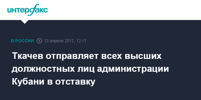 Краснодар. 13 апреля. INTERFAX.RU - Губернатор Краснодарского края Александр Ткачев сообщил в своем "Твиттере" в пятницу, что будут отправлены в отставку все высшие должностные лица администрации региона.