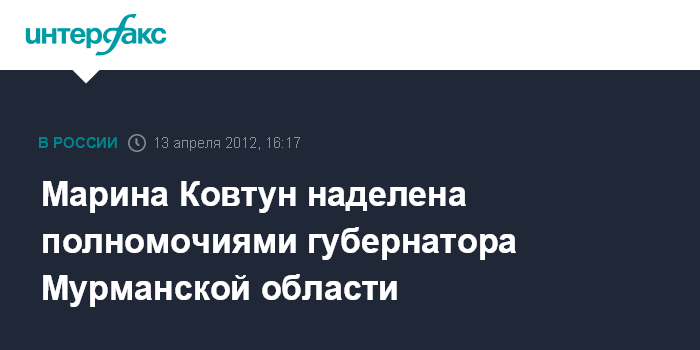 Мурманск. 12 апреля. INTERFAX.RU - Мурманская областная дума в пятницу на внеочередном заседании утвердила кандидатуру Марины Ковтун на посту губернатора.