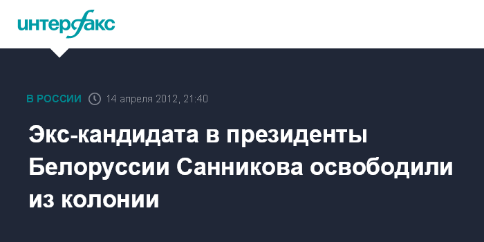 Минск.14 апреля. ИНТЕРФАКС - Бывший кандидат в президенты Белоруссии Андрей Санников освобожден из колонии в Витебской области и сейчас находится на пути в Минск, сообщают белорусские интернет-ресурсы.